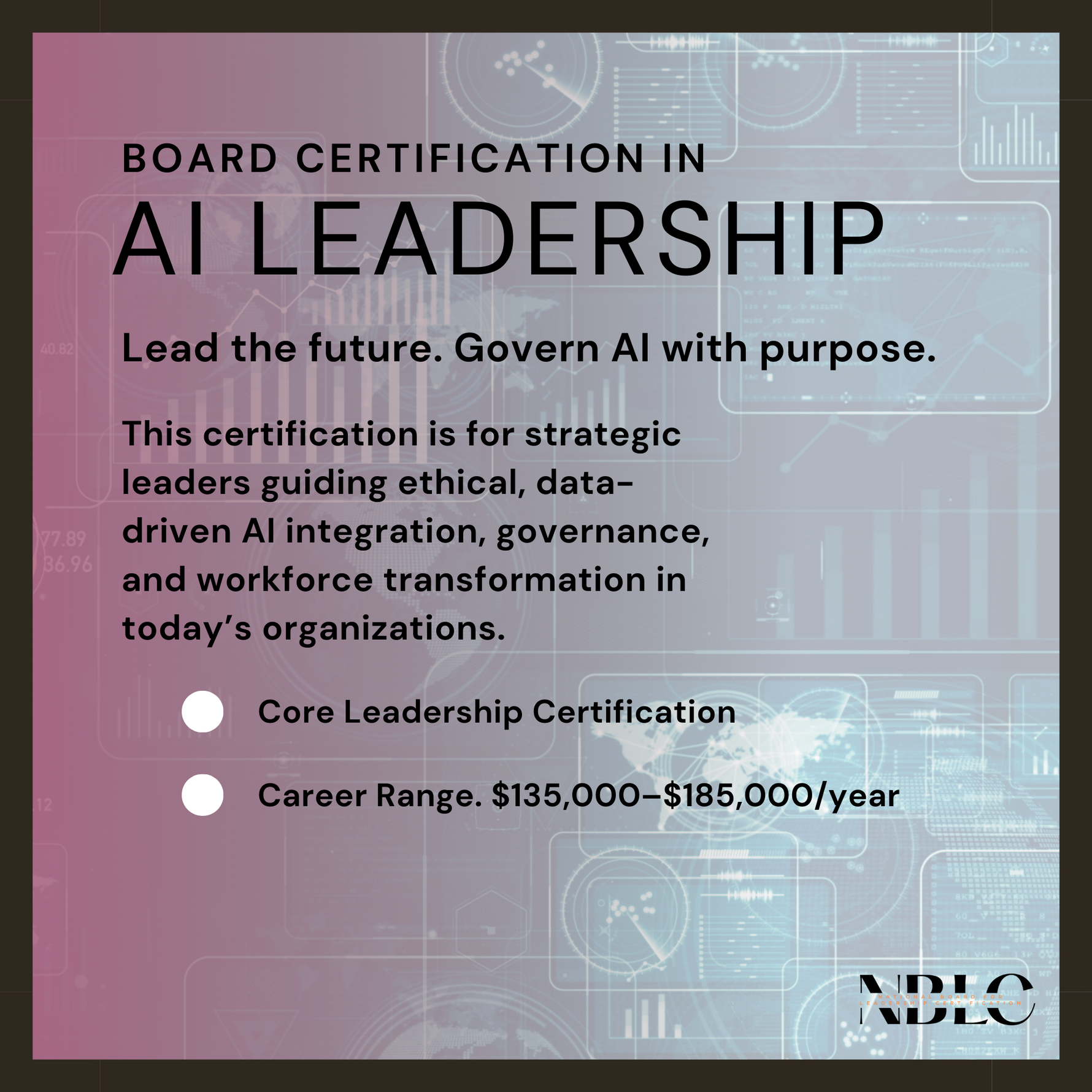The Board-Certification in AI Leadership (BCAIL) is designed for forward-thinking leaders responsible for integrating AI into strategic, ethical, and operational frameworks. This credential goes beyond technical fluency — preparing you to lead responsibly in a world increasingly shaped by automation, data, and decision intelligence.