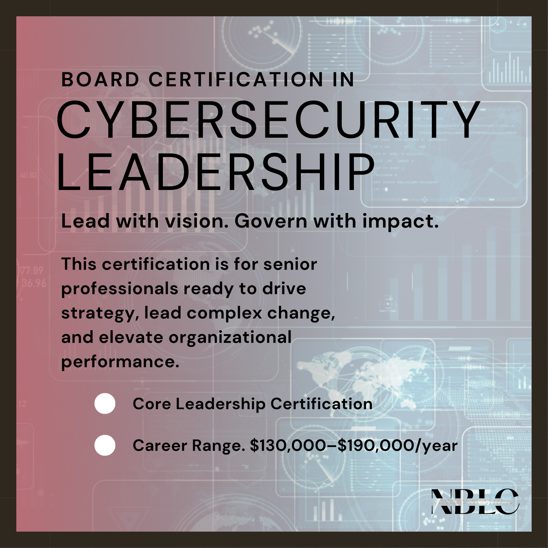The Board-Certification in Cybersecurity Leadership (BCCL) prepares non-technical and strategic leaders to govern cybersecurity risks, ensure compliance, and guide organizations through increasing digital threats.